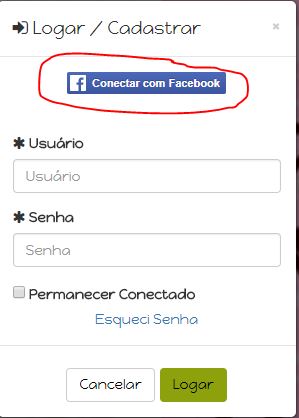 Para logar, basta digitar seu usuário e senha escolhido e clicar em Logar! Ou clicar em conectar com o facebook, caso já tenha cadastrado, ele irá conectar você ao sistema automaticamente!