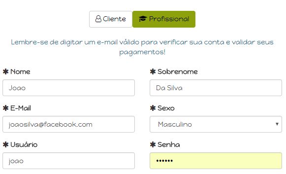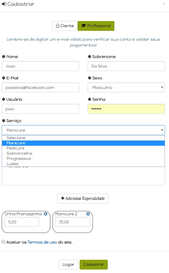 Caso seja um usuário profissional, click no botão Profissional, confira os dados importados do facebook, selecione seus serviços e suas especialidades com os valores em Reais!