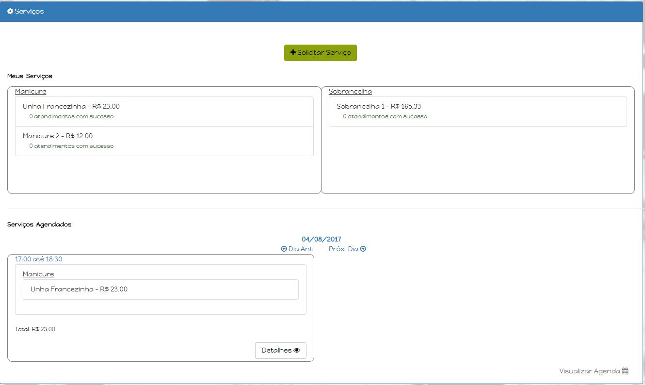Na caixa de "Serviços", você verificará os serviços e as especialidades com os preços cobrados, no caso de um usuário profissional. Também irá verificar os últimos serviços cadastrados para aquele usuário. Você pode navegar pelos dias, clicando nas setinhas de anterior e próximo, pode clicar na data, para selecionar um dia específico, também pode clicar no link Visualizar Agenda, para ver todos os compromissos daquele usuário. Caso esteja visualizando o perfil de um profissional, você pode clicar no botão "Solicitar Serviço", para cadastrar um pedido na tela de perfil, sem precisar ir para a tela de agenda!