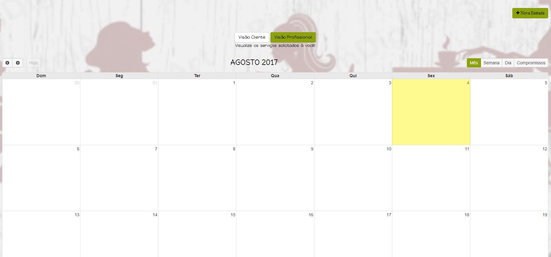 O calendário possui visão do profissional e do cliente, visualização Mensal, Semanal, Diária e em Lista de Compromissos do mês! Você pode navegar pelos Meses através das setas de navegação à esquerda e pode cadastrar solicitações!