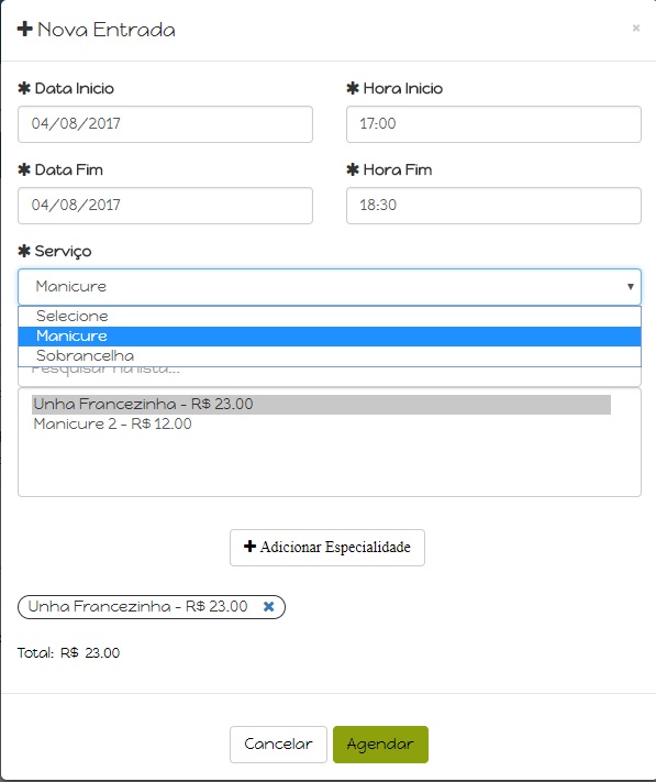 Ao clicar no botão "Nova Entrada" no módulo de agenda, ou pelo botão "Solicitar Serviço" no módulo do Perfil do usuário,