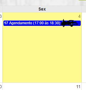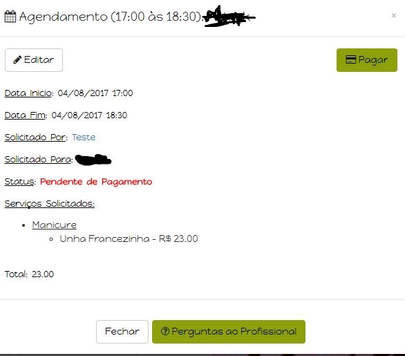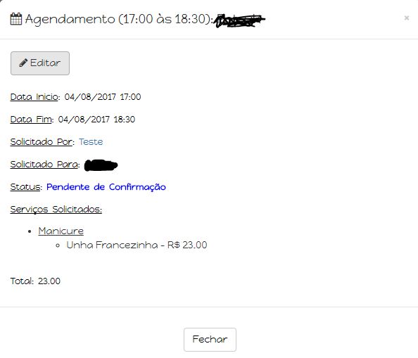 Ao preencher todos os campos corretamente, você pode clicar no botão Agendar, qual confirmará sua solicitação e enviará uma notificação ao profissional. Você verá sua solicitação no calendário e poderá clicar no título que conterá o seu primeiro nome e o horário solicitado para poder visualizar os detalhes da solicitação e poder editar o conteúdo.