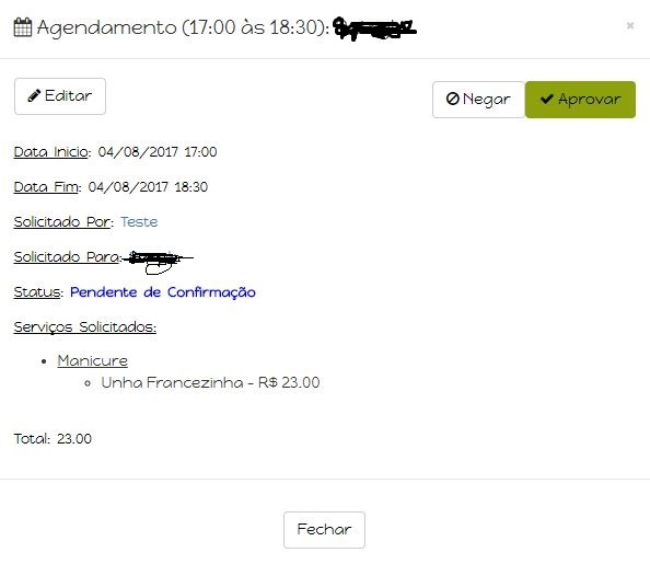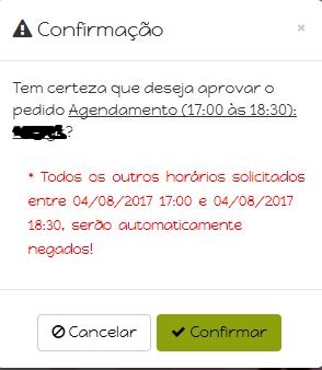 ** Ao aprovar, você receberá uma confirmação de que todas os pedidos solicitados que estejam dentro do período desta solicitação, serão automaticamente negados. Ou seja, se você aprovar um pedido que está agendado para Hoje de 16 horas às 19 horas, todos os outros pedidos que estiverem entre 16 e 19 horas serão negados automaticamente.