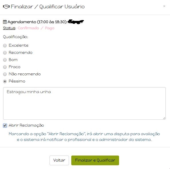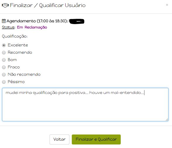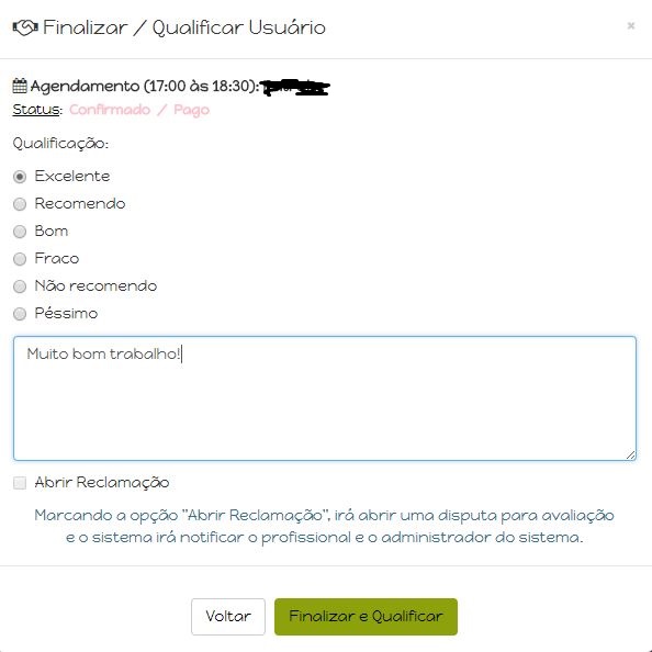 Ao clicar em Qualificar, você poderá escolher o nível de qualificação do profissional / cliente, poderá adicionar uma mensagem, e em caso de qualificação negativa (abaixo de "Bom"), o cliente poderá abrir uma disputa para recuperar seu dinheiro.