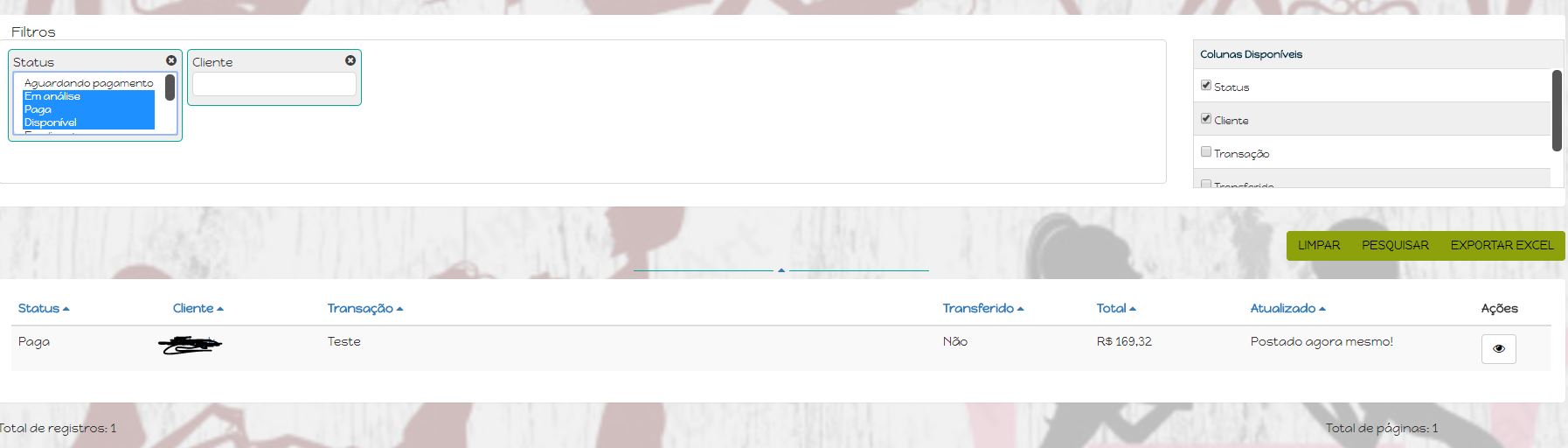 Na página de transação, você pode visualizar as informações sobre suas transações, realizar filtros e exportar para Excel.